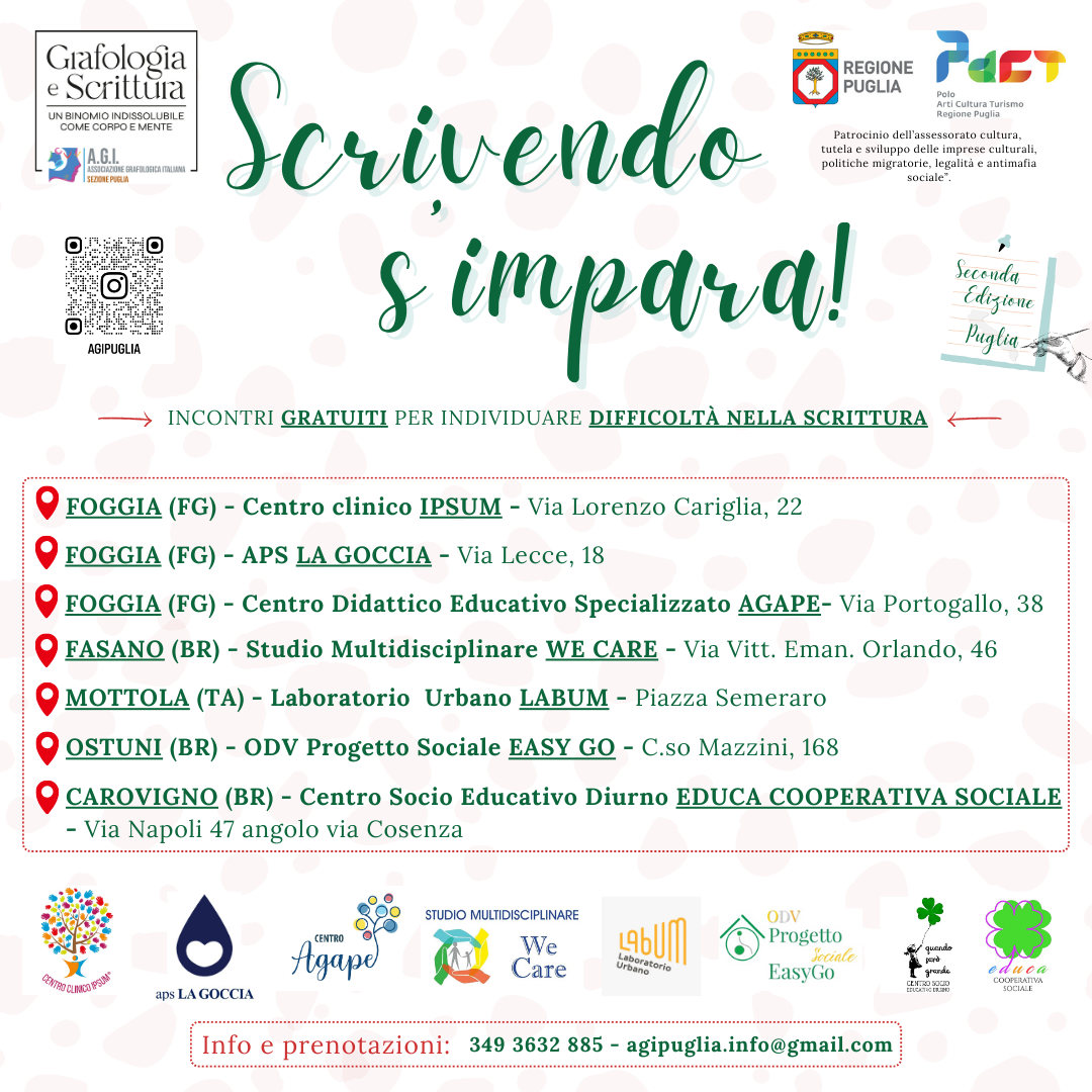 L’iniziativa, che ha ricevuto anche il patrocinio dell’Assessorato cultura, tutela e sviluppo delle imprese culturali, politiche migratorie, legalità e antimafia sociale della Regione Puglia, si articola in una serie di incontri gratuiti per individuare difficoltà nella scrittura di bambini, ragazzi e adulti e si svolgerà contemporaneamente in tutta la Puglia nei centri specialistici – educativi e associativi del territorio regionale che hanno aderito.