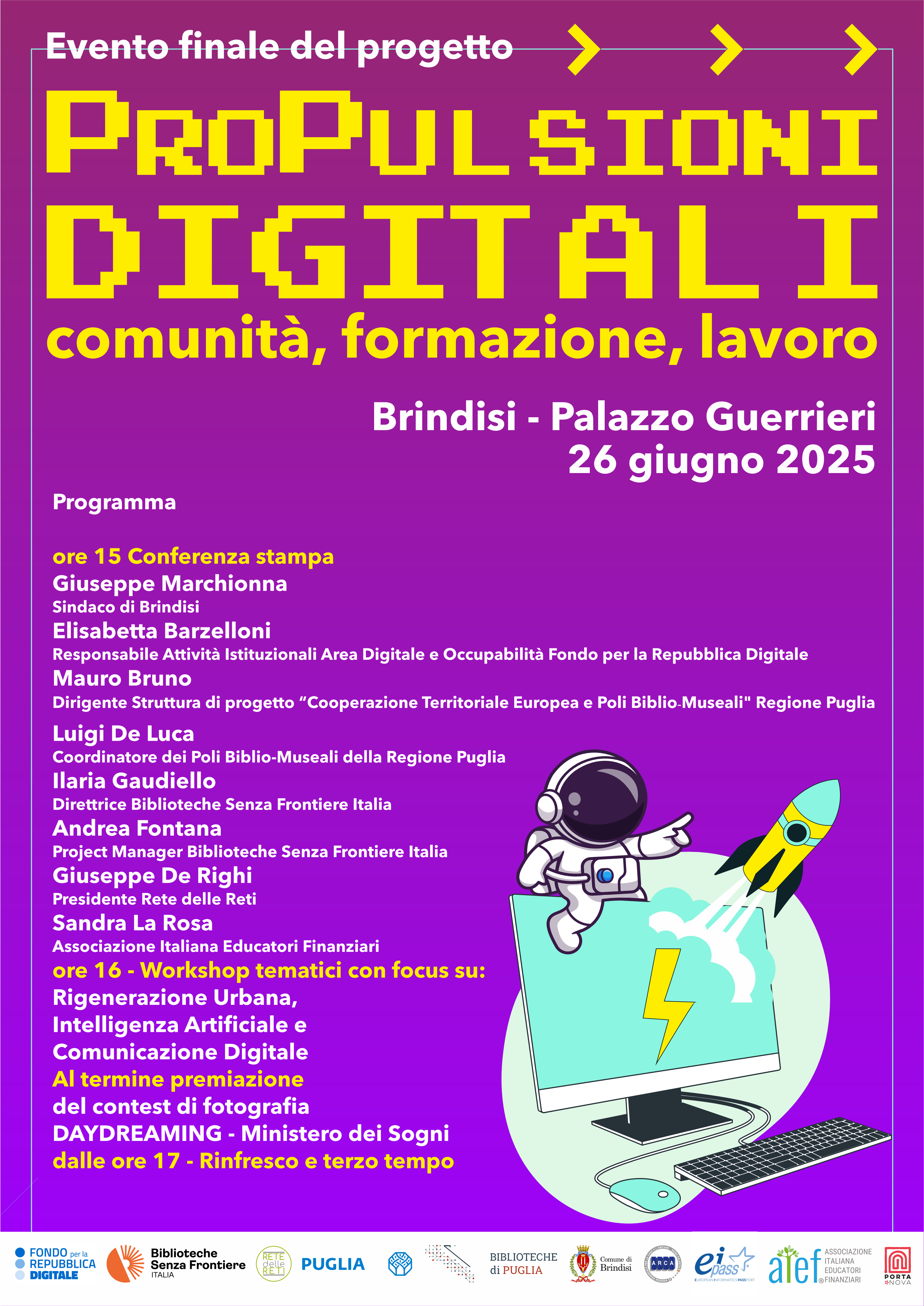 Si conclude a Brindisi il progetto “(PRO)Pulsioni Digitali: comunità, formazione, lavoro”, promosso da Biblioteche Senza Frontiere Italia in partnership con Rete delle Reti e con la collaborazione della Regione Puglia. L’evento finale si terrà il 26 giugno 2025 dalle ore 15 alle 17 a Palazzo Guerrieri, nel centro storico della città, con il patrocinio della Città di Brindisi.